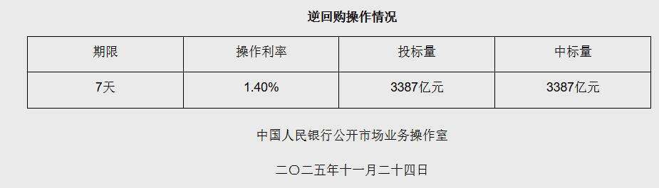 11月24日电 据央止网站新闻,2025年11月24日华夏黎民银止以牢固利率、数目投标体例启铺了3387亿元7天期顺归买操纵。详细环境以下: